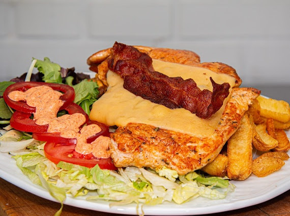 Bacon, Cheddar Sajt, Csirkemell filé, Házi szósz , Paradicsom, Sültkrumpli