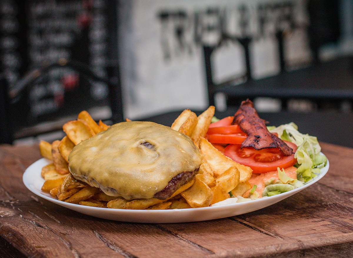 Bacon, Cheddar Sajt, Házi szósz , HÚSpogácsa, Paradicsom, Sültkrumpli
